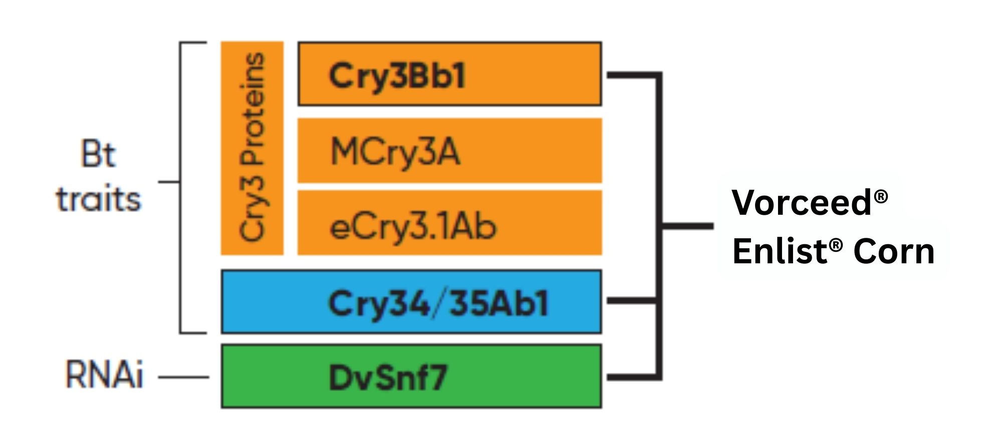Figure 1. Vorceed Enlist corn contains three modes of action for protection against corn rootworm: two Bt traits (Cry3Bb1 and Cry34/35Ab1) and RNAi (DvSnf7).